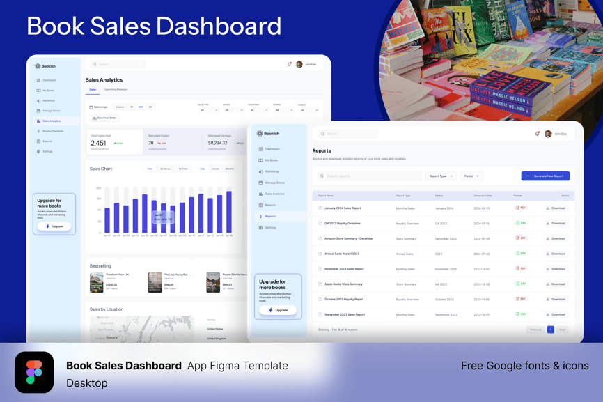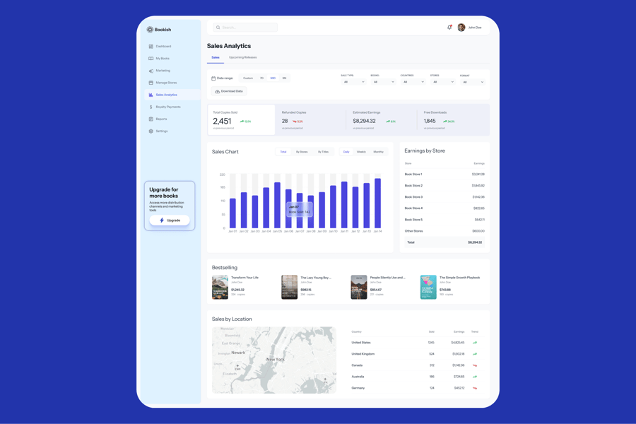 这款简洁的仪表盘用户界面模板专为希望在一个地方可视化和管理销售报告的独立作者、出版商或电子书分销商而设计。