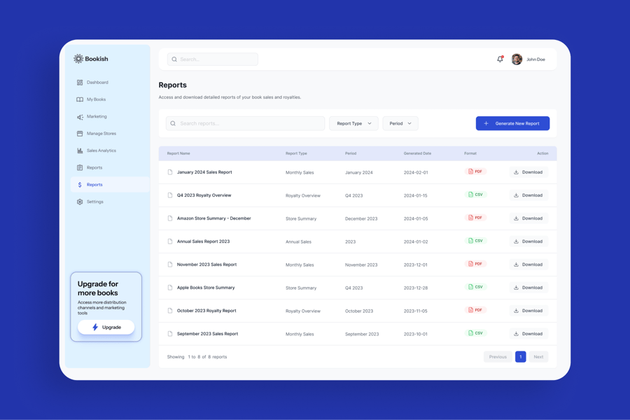该布局采用现代化的表格视图,用户可以轻松访问、下载和生成图书销售及版税报告。凭借直观的结构和友好的交互方式,此模板非常适合创建用于处理图书分析、商店管理和收入洞察的专业 Web 应用程序。