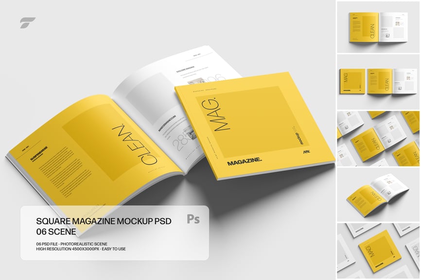 使用我们优质的方形杂志样机套装,轻松展示您的杂志设计。这套样机包含 6 个完全可编辑的 PSD 文件,是设计师、营销人员和出版商的理想之选,让您轻松展示作品。