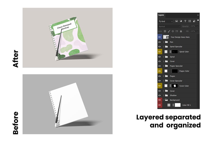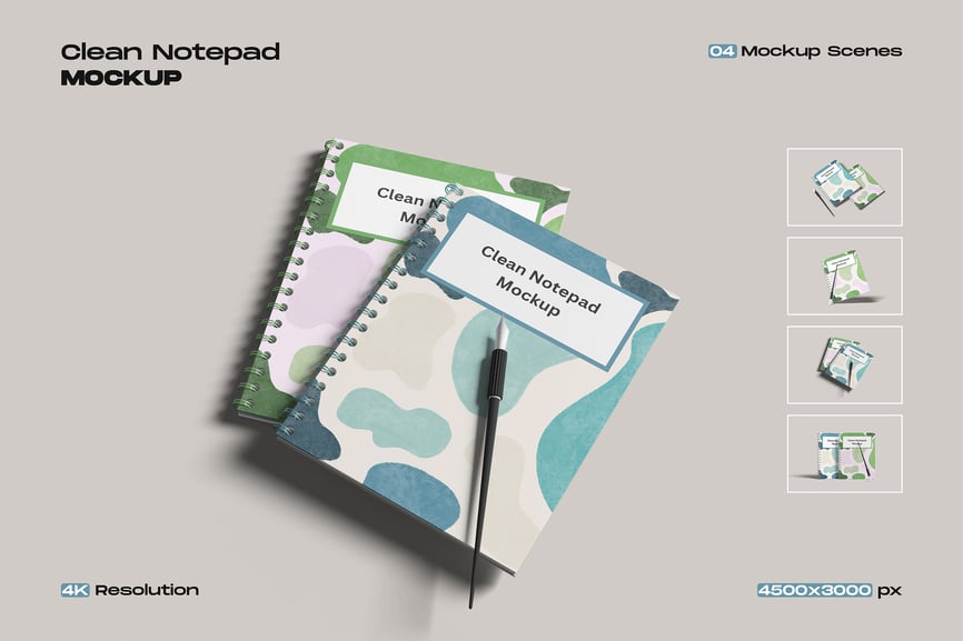 **记事本样机 — 简洁文具场景** 是一款展示在现代办公桌上的样机。非常适合以专业的方式展示品牌、文具设计或徽标。智能对象图层让自定义变得快速便捷——只需替换您的素材,保存即可导出高质量结果。