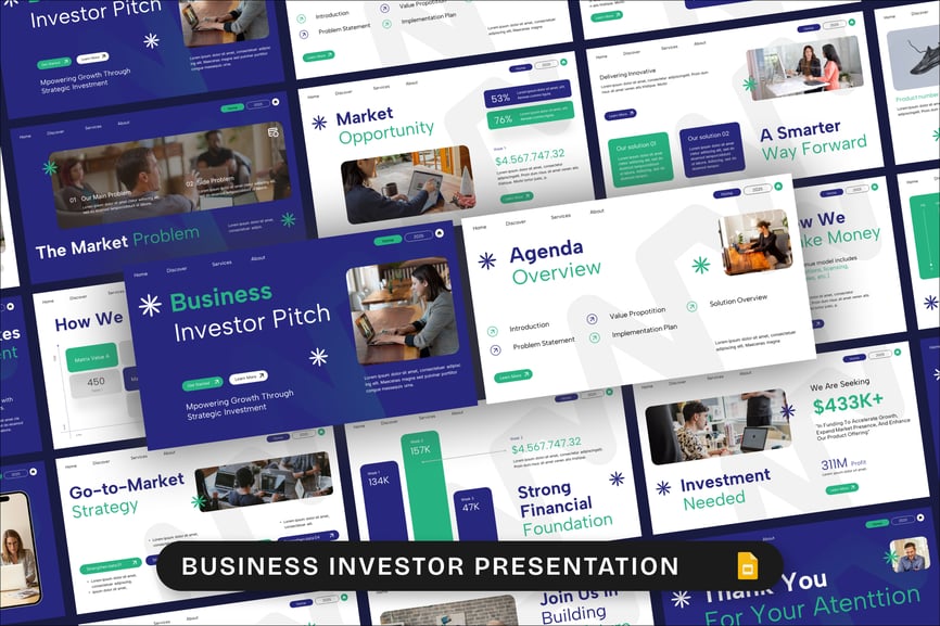 使用这款商业投资者谷歌幻灯片演示模板,自信地展示您的商业投资方案。这款现代化的幻灯片模板专为初创公司、企业、风险投资路演和融资演示而设计,可帮助您清晰而优雅地传达价值、财务预测、市场机遇和增长战略。