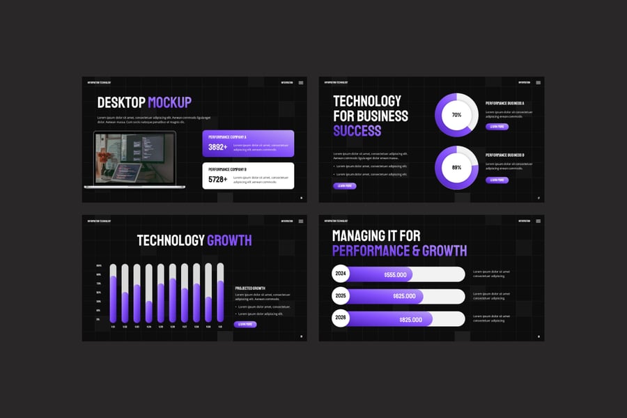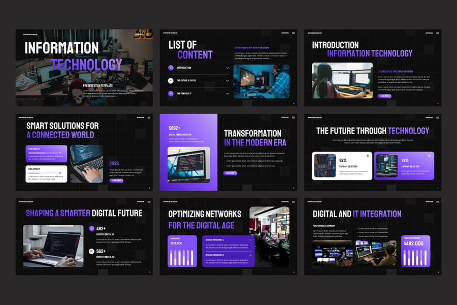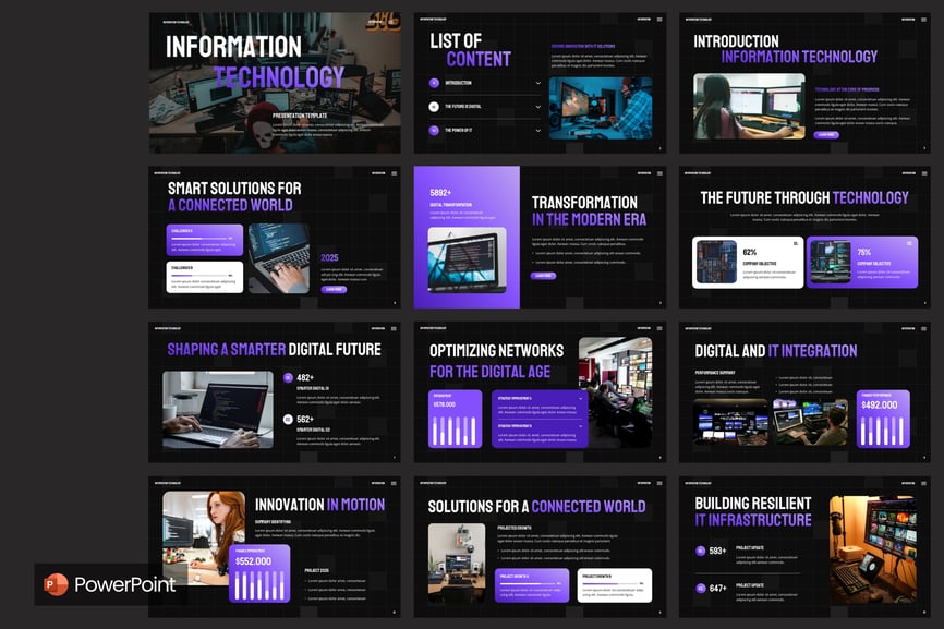 使用信息技术 PowerPoint 演示模板,提升您的技术演示效果。这套现代、专业且完全可定制的幻灯片专为 IT 公司、软件开发、网络安全、人工智能技术、数字化转型和数据分析项目而设计。该模板提供简洁的布局、信息图表和数据驱动的图表,帮助您清晰地传达复杂信息。凭借独特的幻灯片、拖放式图像占位符和可编辑的矢量图,创建令人惊艳的技术演示文稿从未如此轻松。