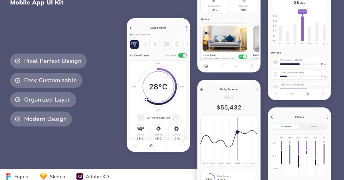 每个屏幕都可完全自定义,易于使用,并针对 Figma、Sketch 和 Adobe XD 进行了精心设计。