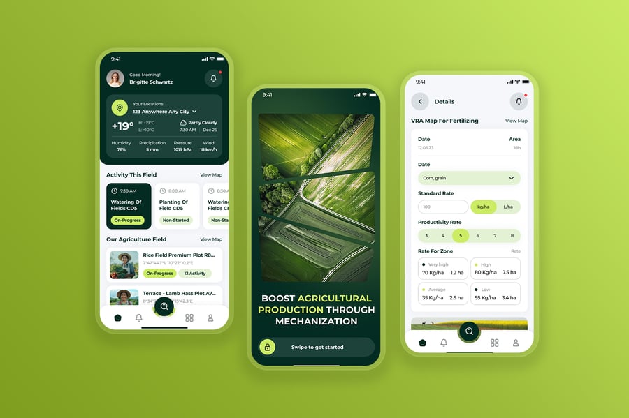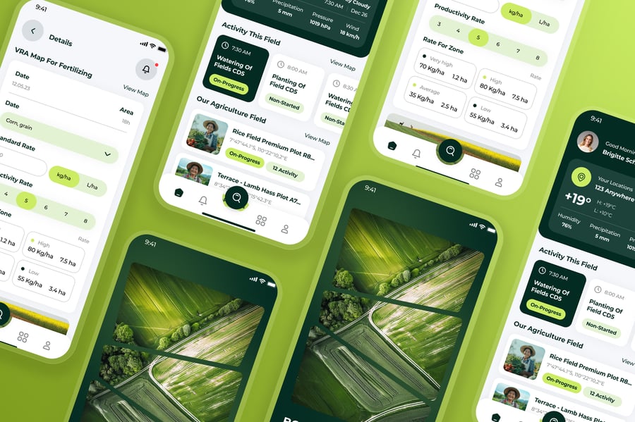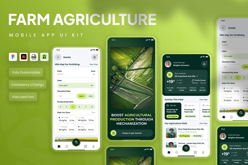 隆重推出一款现代简洁的农场农业移动应用用户界面套件,旨在支持农业管理、智能农业监测、作物产量追踪、牲畜管理、施肥计划、农产品交易等数字化解决方案。该套件采用清新自然的色彩,如绿色和大地色系,搭配有机图标和用户友好的布局,使应用操作直观且功能强大。