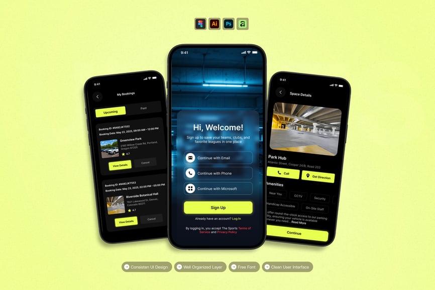**Parking Space** UI 套件的设计重点在于易用性和一致性,让您轻松创建美观实用的移动应用。每个元素都经过精心构建,完全可定制,并可根据您的品牌进行调整。无论您是设计社交应用、电商应用还是效率工具,此套件都能让您灵活地将创意变为现实。