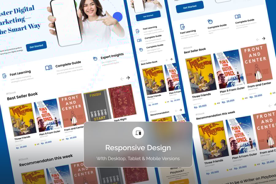 这款数字营销电子书着陆页模板采用结构化的营销流程和现代化的用户界面设计,自信而权威地传达您电子书的价值。醒目的主标题、极具说服力的优势亮点以及可视化的章节划分,共同打造出引人入胜且值得信赖的视觉效果。对于希望电子书外观精美、可信且符合当今数字营销美学的创作者而言,这款模板堪称完美之选。
