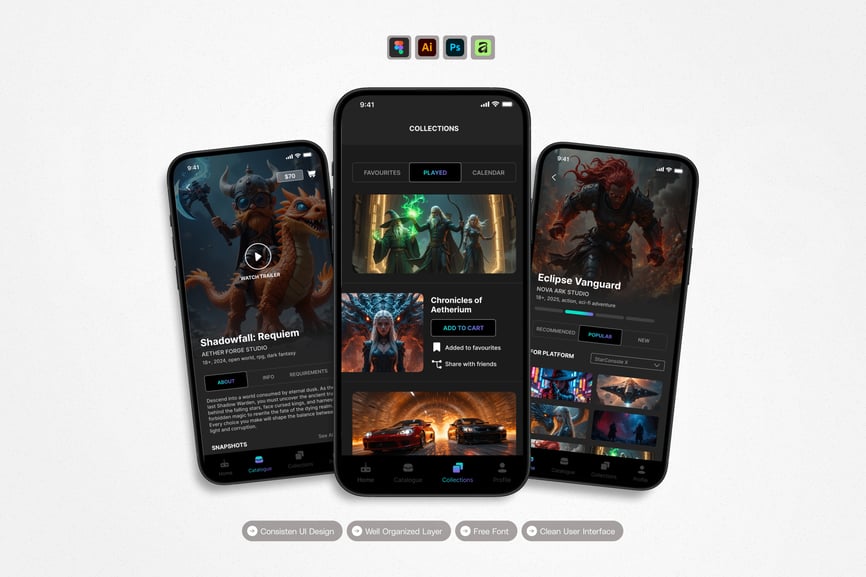 隆重推出 **Game Central** 移动应用 UI 套件,这是一款现代化且功能全面的解决方案,可助您创建简洁易用的应用界面。对于希望加快设计流程的设计师和开发者而言,这款 UI 套件堪称完美之选,它将您所需的所有基本组件整合在一个井然有序的软件包中。