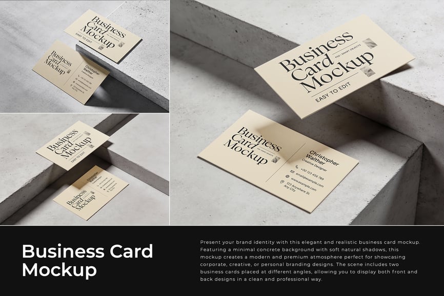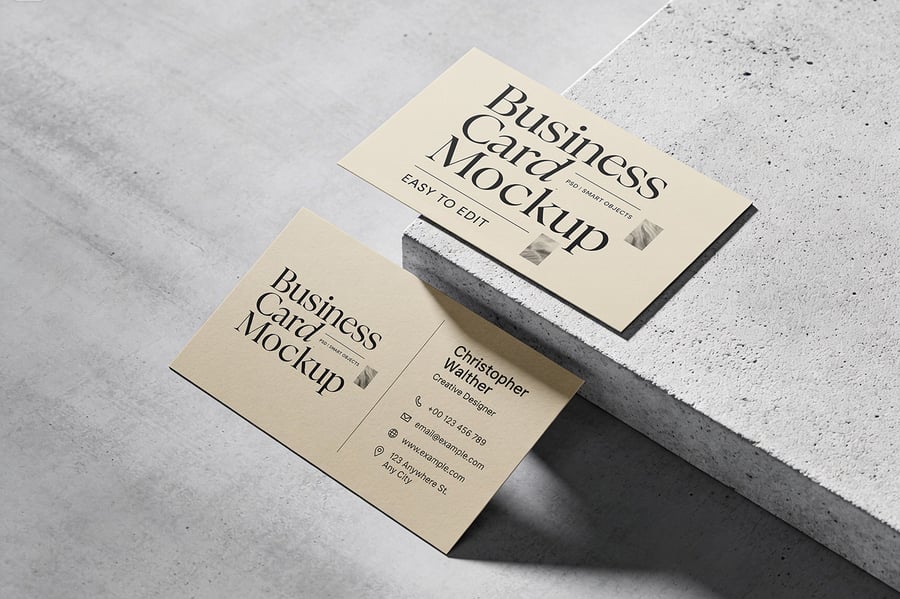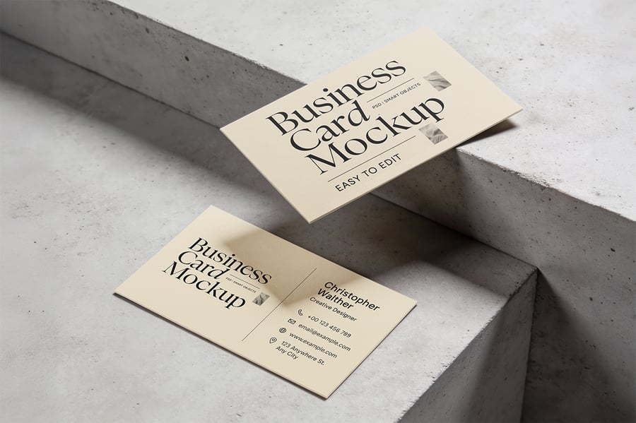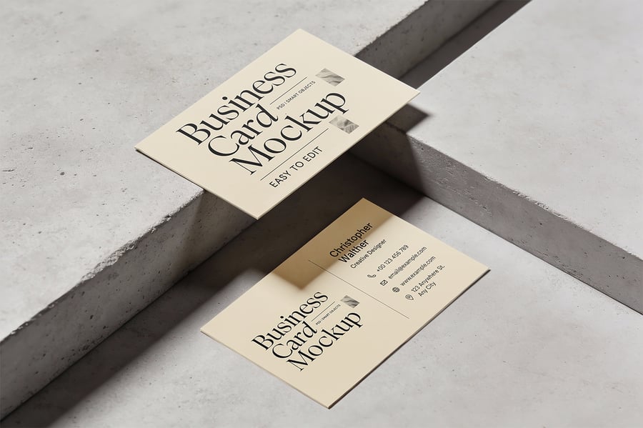 这款优雅逼真的名片样机,助您完美展现品牌形象。样机采用简约的混凝土背景,搭配柔和自然的阴影,营造出现代高端的氛围,是展示企业、创意或个人品牌设计的理想之选。场景中包含两张不同角度的名片,方便您以简洁专业的方式展示名片的正反两面。样机采用智能对象设计,易于编辑,呈现高质量、照片级的逼真效果,适用于演示文稿、作品集和营销预览。