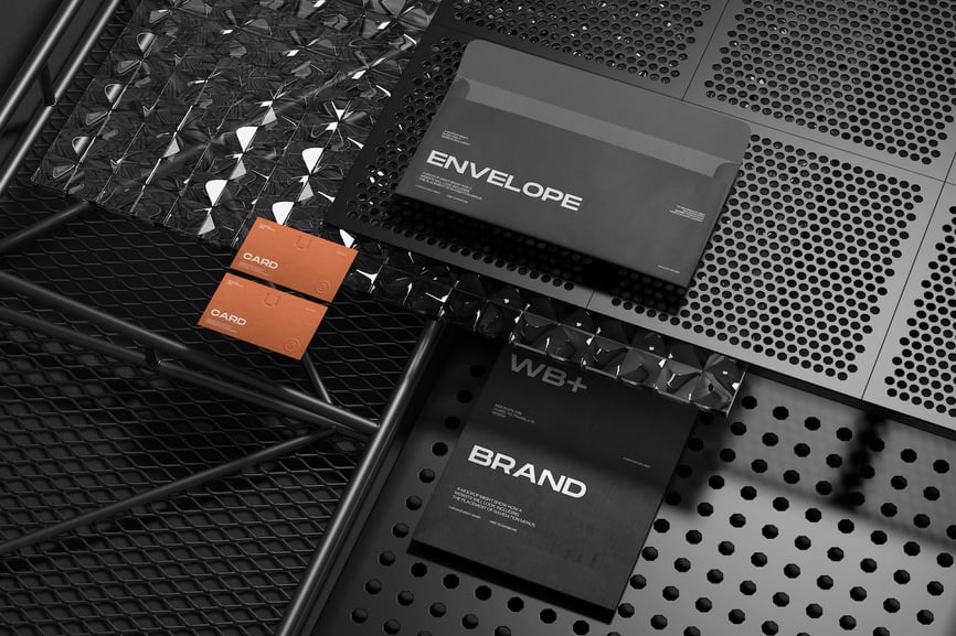 此模型场景展示了信封、卡片和文件等办公用品,它们排列在一个结构化的表面上。它适用于展示印刷版式、企业形象和办公用品设计理念
