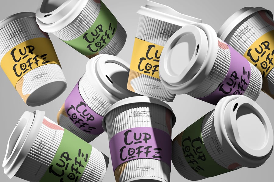 这套模型素材展示了多款带杯套和杯盖的纸质咖啡杯,以动态布局呈现。它适用于展示外卖饮品品牌、杯标和包装设计。
