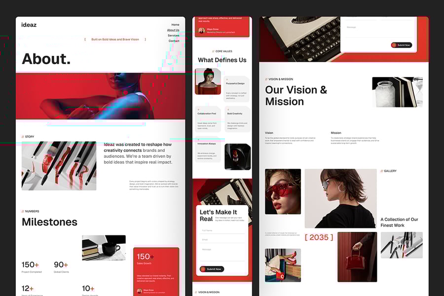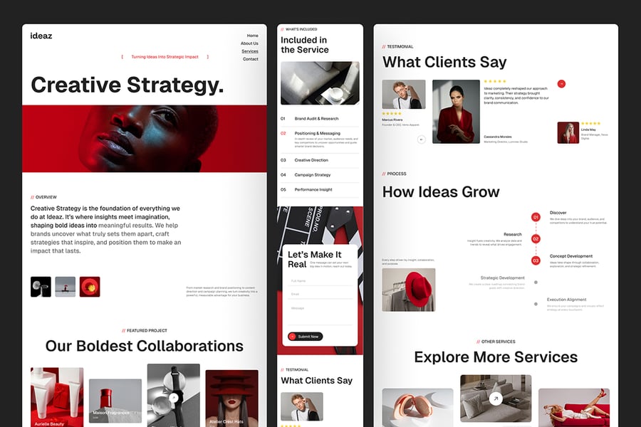 Ideaz 采用大胆的、受编辑风格启发的视觉方向,并将创意置于核心地位: