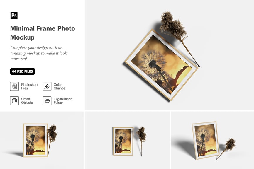 用这些精美的素材样机展示您的**极简相框照片样机**。此样机包含 4 个元素,每个元素都配有分层清晰的 PSD 文件。此外,此样机还采用了智能对象功能,这意味着您只需几秒钟即可轻松快捷地将当前设计替换为您自己的设计。