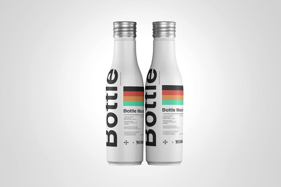 此模型展示了两个铝制饮料瓶,用于标签和包装设计展示。它适用于饮料、果汁、汽水或产品品牌推广概念。