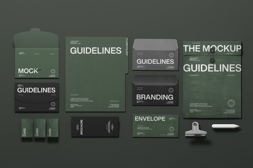 这套样机包含配套的办公用品,包括文件夹、信封、卡片和文件,布局简洁明了。它适用于展示企业形象、品牌系统和印刷设计项目