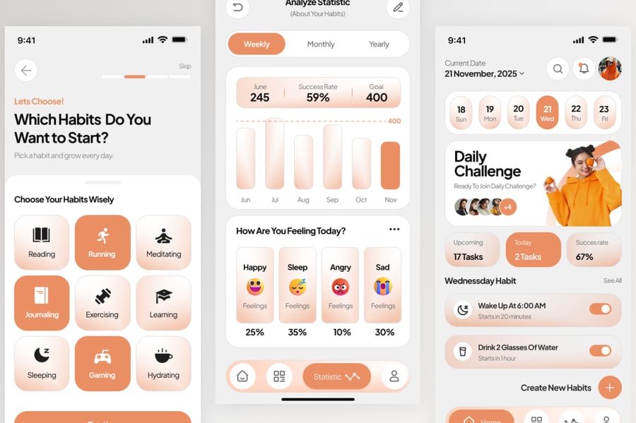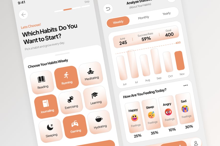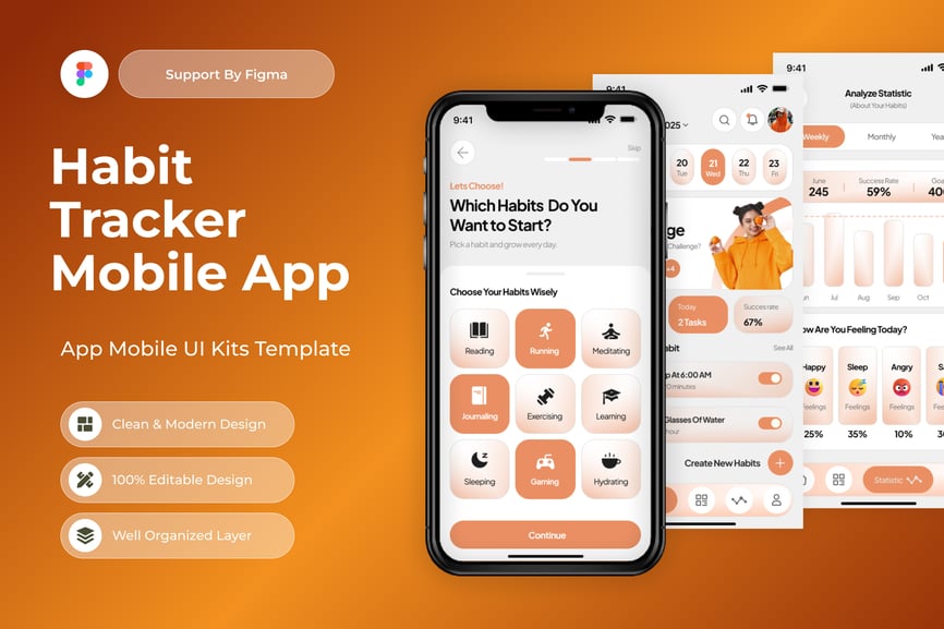 使用这款专业设计的模板,轻松打造功能强大的习惯追踪移动应用。