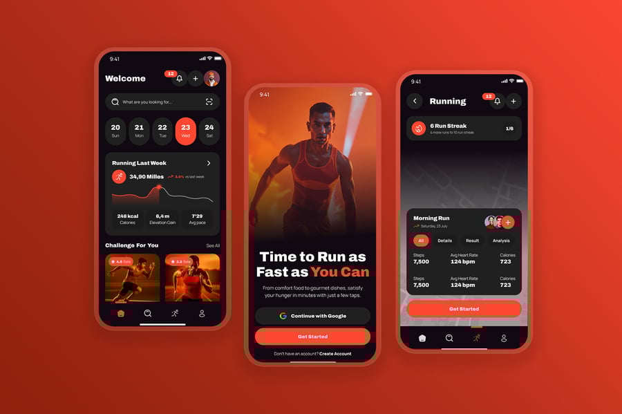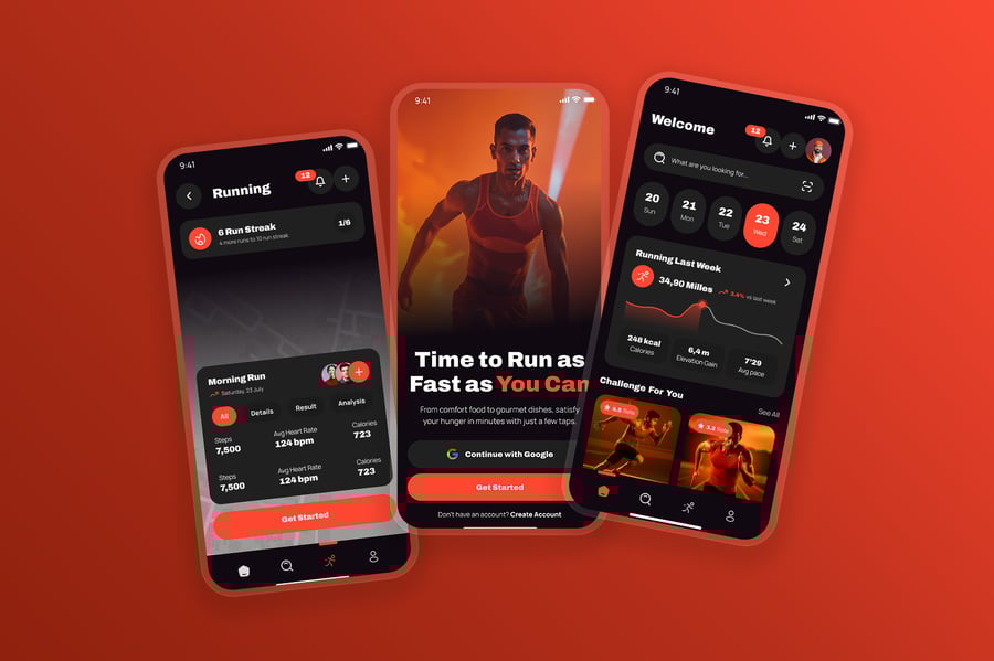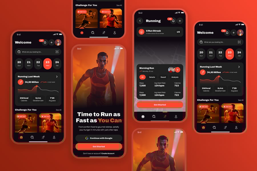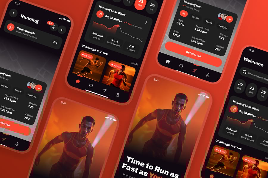 隆重推出 Kalcer 跑步移动应用 UI 套件,该套件现代而充满活力,专为专注于跑步活动追踪、马拉松训练、每日锻炼进度、GPS 路线追踪、配速和距离分析、排行榜竞赛、健身目标和社区挑战的应用而设计。该 UI 采用橙色、红色和海军蓝等动感十足的运动色彩,搭配简洁的字体,旨在为用户带来激励人心、以表现为导向的体验。