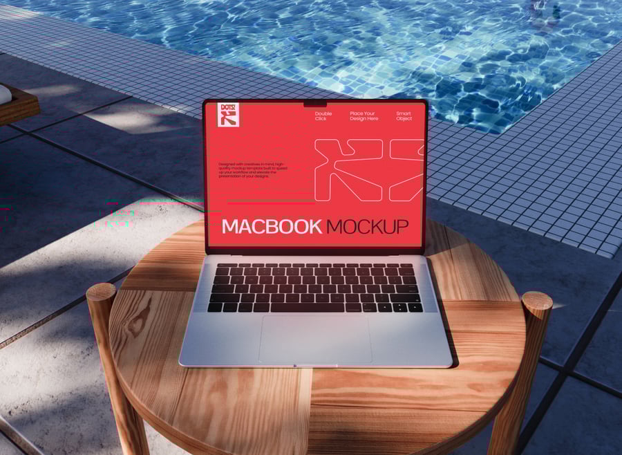 **MacBook 在泳池边的模拟场景**
