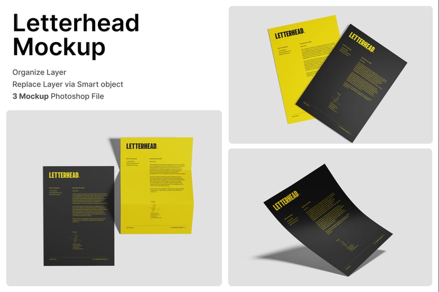 信纸样机是一款专业的 Photoshop 样机,旨在以简洁现代的方式展示企业信笺和官方文件设计。该样机拥有逼真的纸张纹理、自然的阴影和多角度的视角,能够清晰地突出版式结构、字体和品牌细节。