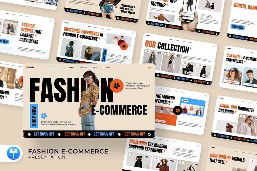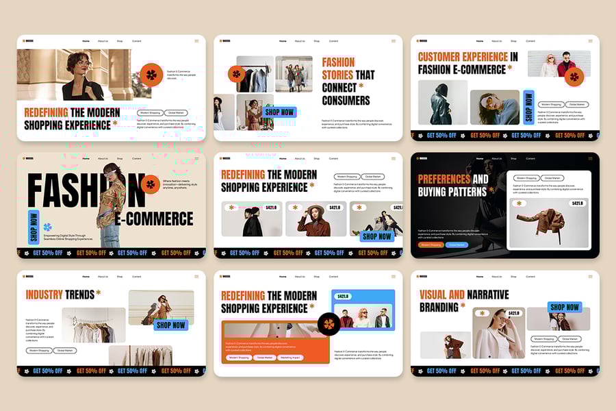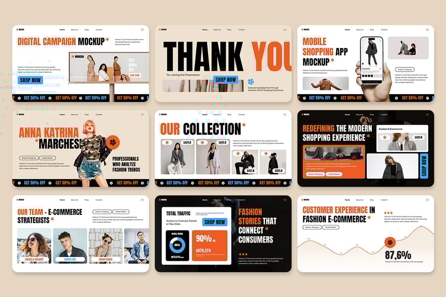 使用这款时尚电商演示模板提升您的品牌形象,提高转化率。这套简洁现代的幻灯片模板专为时尚零售商、线上精品店和创意电商团队量身打造。该模板兼顾时尚与销售,融合了T台美学与实用零售功能:产品图册、以转化为导向的布局、价格表、社交证明部分以及将数据转化为实际行动的数据驱动图表。