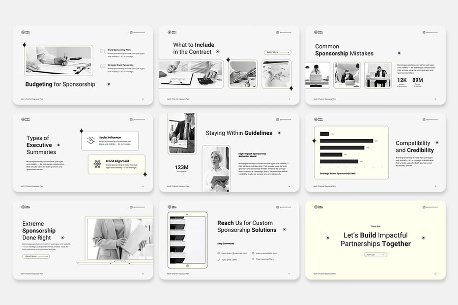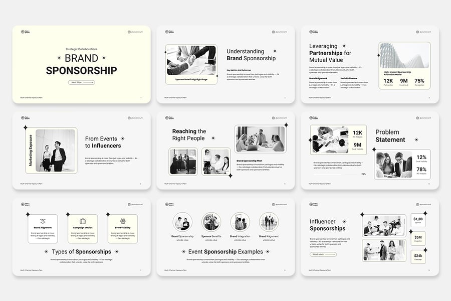 此模板融合了简洁现代的布局和极具冲击力的视觉叙事:包含专门的赞助商价值展示幻灯片、分级套餐、受众及覆盖范围分析、投资回报率预测、活动时间表、品牌化模型以及灵活的定价表。每张幻灯片均可完全编辑——只需几秒钟即可更改颜色、字体和占位符,以匹配您的品牌形象。内置的图标集、矢量图形和专业排版的图表,让您能够自信地展示各项指标和价值主张。