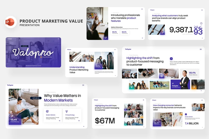 **产品营销价值演示 – 商业营销 PowerPoint 演示文稿** 使用“产品营销价值”PowerPoint 模板,提升您的演示效果。这款模板功能多样、创意十足且设计简洁,专为企业和个人用户打造。它融合了现代美学与专业气质,是任何希望给客户或利益相关者留下深刻印象的人士的理想之选。凭借其灵活的风格和简洁的设计,“产品营销价值”能够提升您的演示质量,使其成为有效传达理念和提升客户参与度的必备工具。