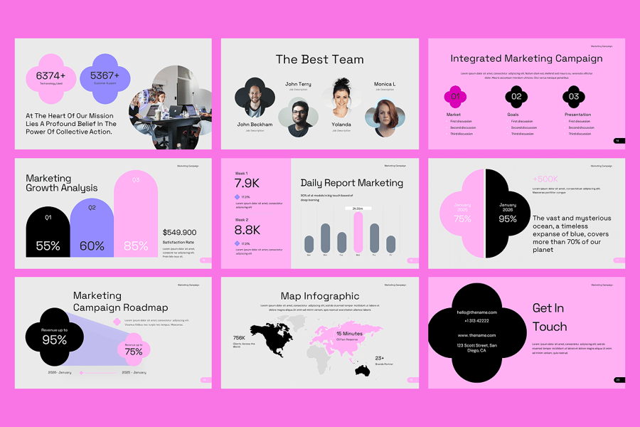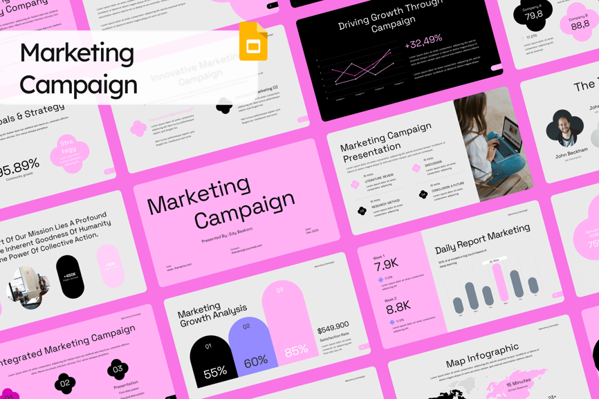这款营销活动谷歌幻灯片演示模板功能强大且设计现代,旨在帮助您自信地展示营销策略、启动营销活动、开展数字推广活动并评估广告效果。该模板非常适合营销团队、代理商、企业主、产品经理和社交媒体专家使用,其专业的视觉布局能够提升观众参与度并强化您的信息传递。