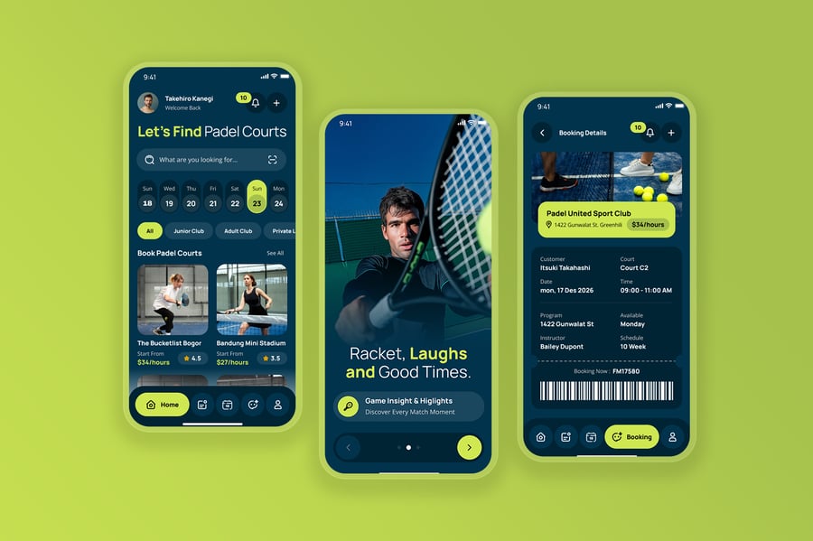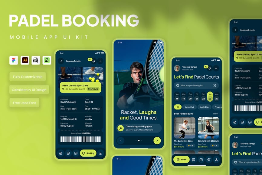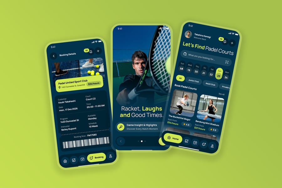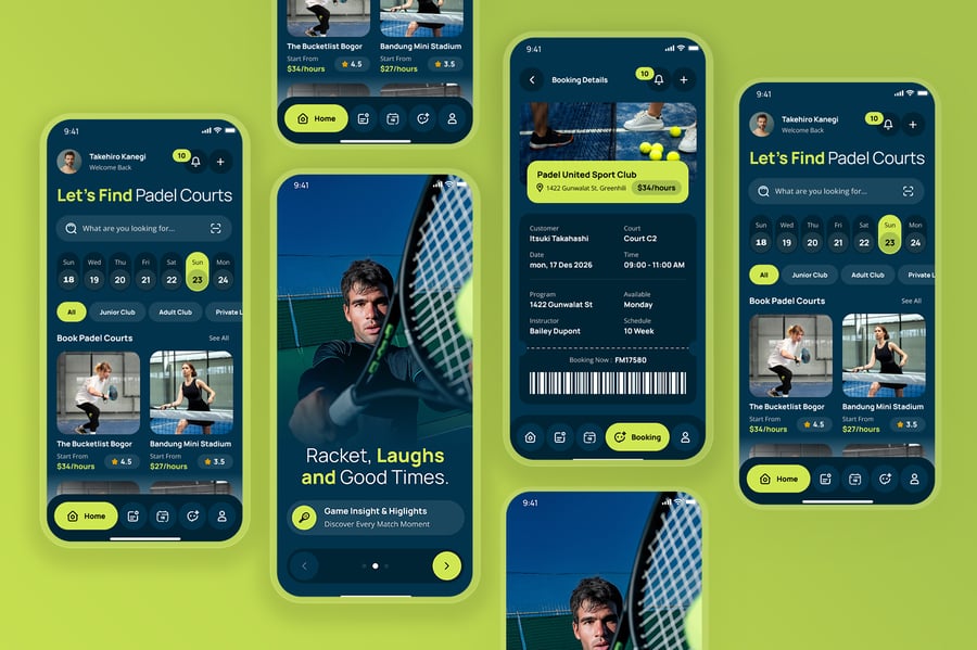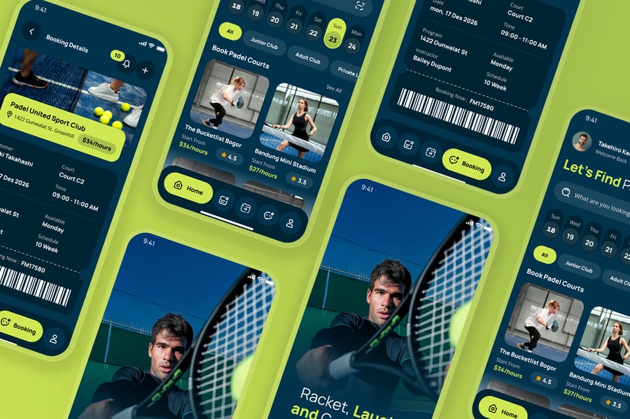 隆重推出 Padel 场地预订移动应用 UI 套件,该套件采用动感时尚、用户友好的界面设计,专为 Padel 场地预订和赛事安排量身打造。此 UI 套件可帮助设计师以简洁直观的移动体验,展示场地可用性、预订时间表、球员资料、比赛管理、支付流程、预订历史记录和通知等功能。