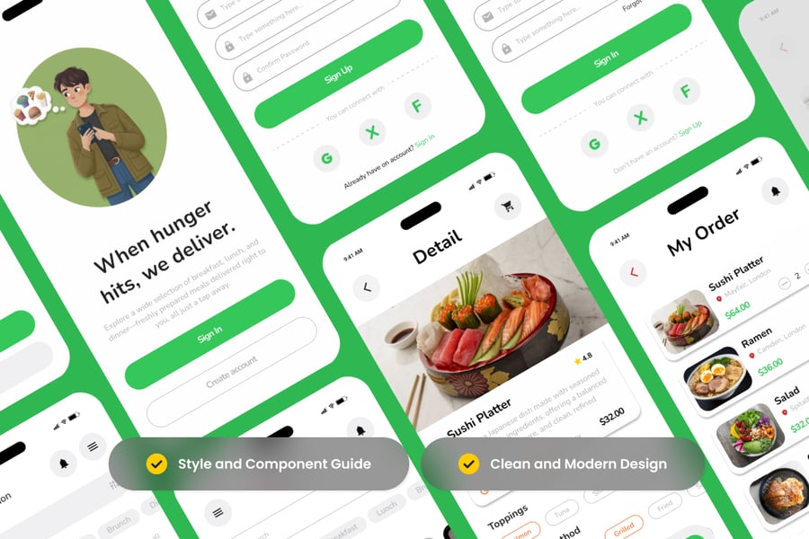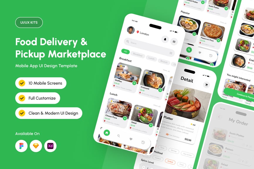 Delishio 是一款简洁美观的外卖平台移动端用户界面,旨在突出美食图片和流畅的下单流程。它融合了柔和的卡片式布局、友好的字体和直观的导航,帮助设计师打造值得信赖、引人入胜且赏心悦目的外卖平台,让用户从浏览到结账全程都能享受愉悦的视觉体验。