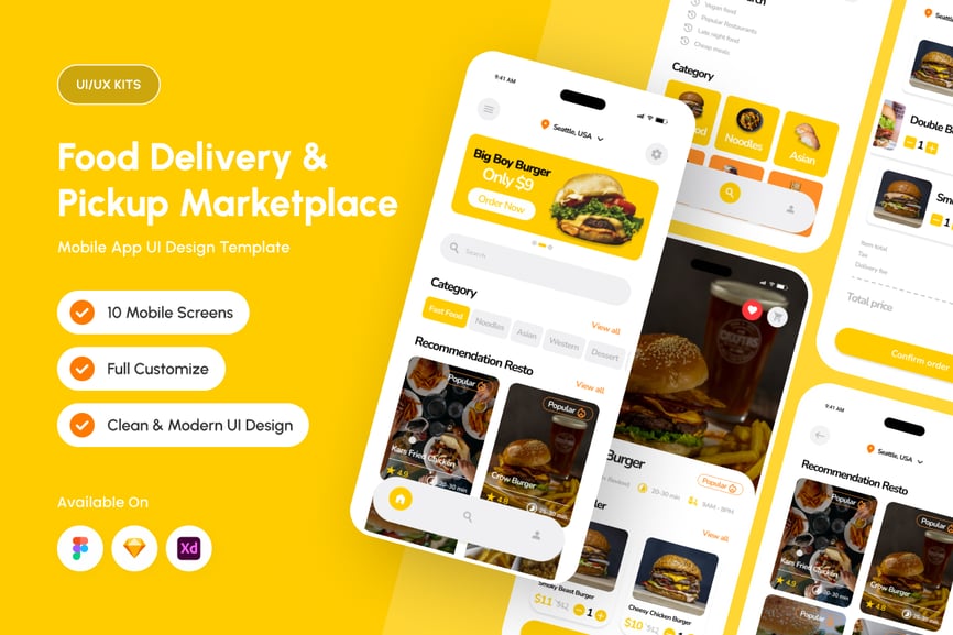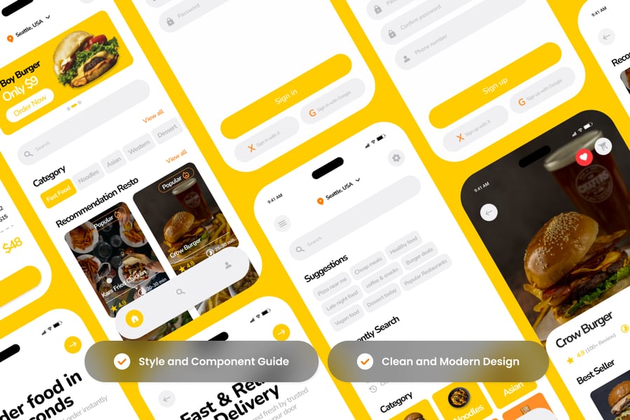 Delivo 是一款智能现代的外卖配送移动用户界面,旨在简化订餐和取餐流程。凭借清晰的布局、醒目的美食图片和易于理解的操作流程,该用户界面可帮助设计师构建高效、可靠、赏心悦目且日常使用舒适的外卖配送平台。