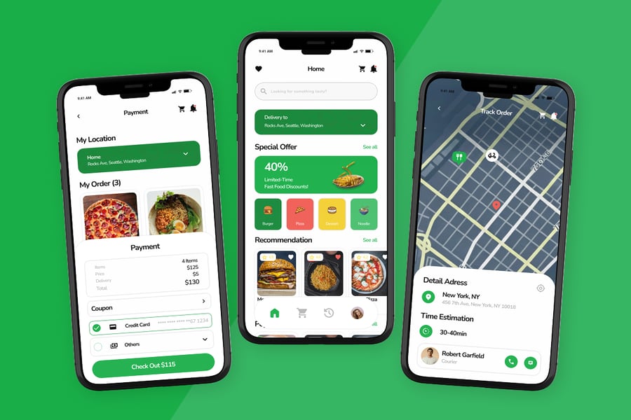 YumHub 是一款现代化的外卖应用,其用户界面旨在让订餐体验变得简单、友好且愉悦。界面采用简洁的布局,搭配充满活力、令人垂涎的橙色点缀和醒目的美食图片,引导用户流畅地浏览餐厅、菜单和结账流程。设计结构确保用户在浏览美食类别和详尽的菜单列表时能够轻松导航。