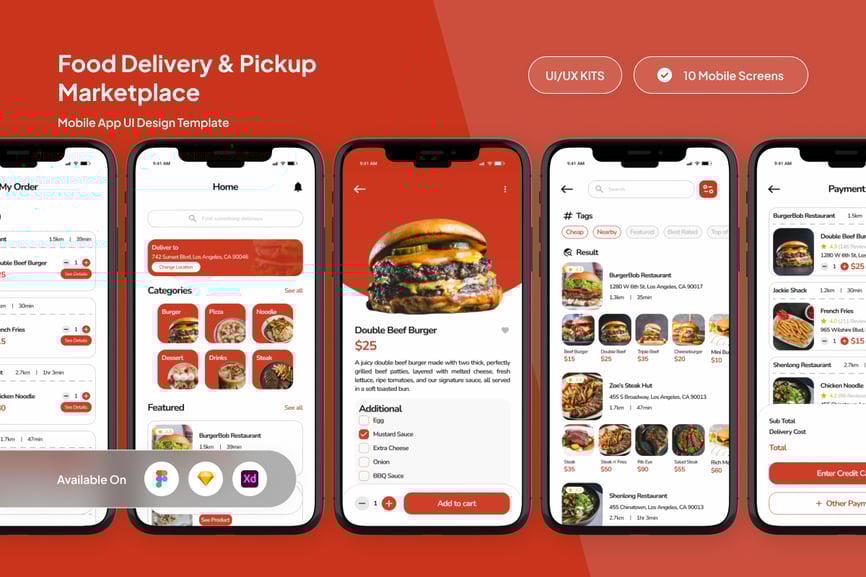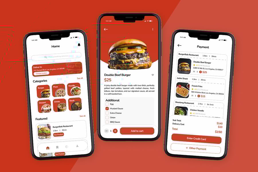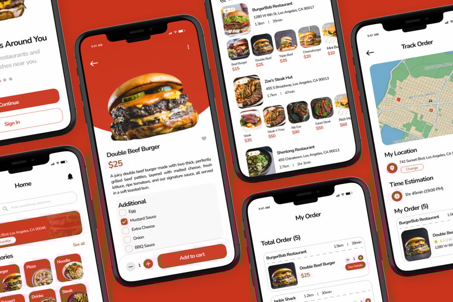 Delcy 是一款外卖平台用户界面,采用活泼而又不失结构感的设计风格,并以醒目而充满活力的红色调为主。界面注重清晰的导航、醒目的美食图片和易于点击的组件,帮助用户轻松浏览餐厅并自信下单。布局经过优化,能够清晰地展示菜品分类、促销活动和菜单详情。
