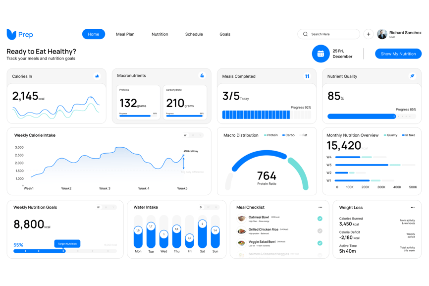 这款现代化的营养和膳食计划仪表盘用户界面概念设计用于移动和网络应用程序,具有卡路里跟踪、宏量营养素分析、进度图表和关键健康指标等功能。