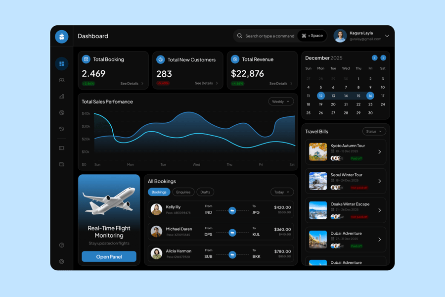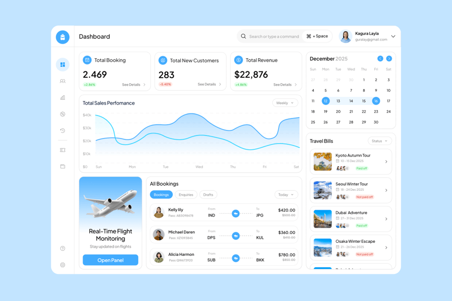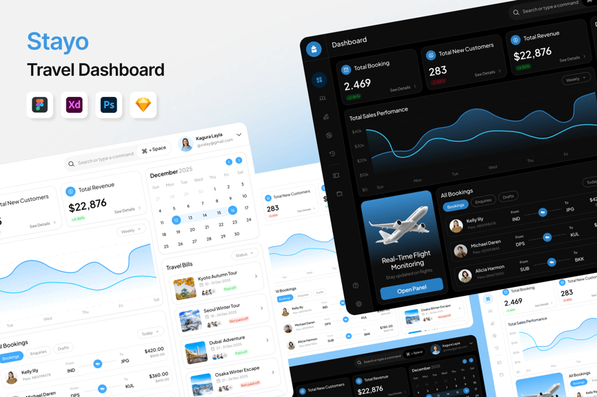Stayo 是一款简洁现代的旅行仪表盘 UI 套件,专为管理行程、住宿和旅行体验的平台而设计。Stayo 以清晰易用为设计理念,帮助用户可视化旅行数据、整理预订、监控行程安排,并在各种旅行相关应用中提供无缝的用户体验。