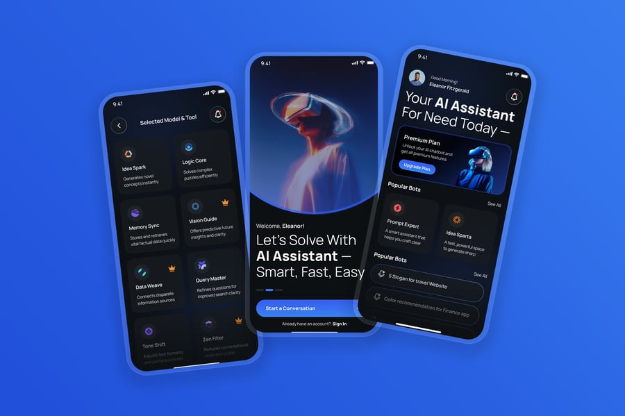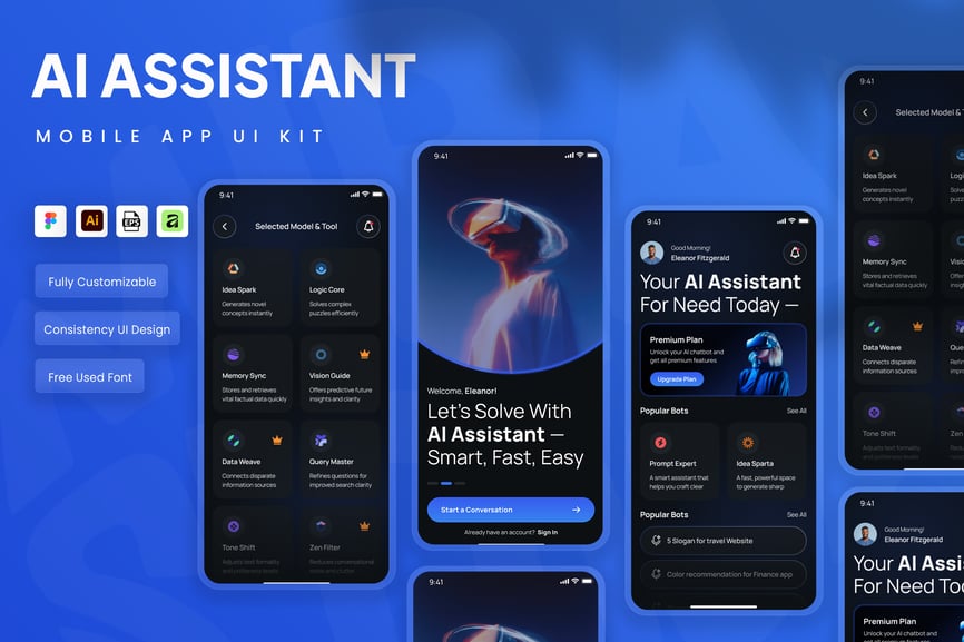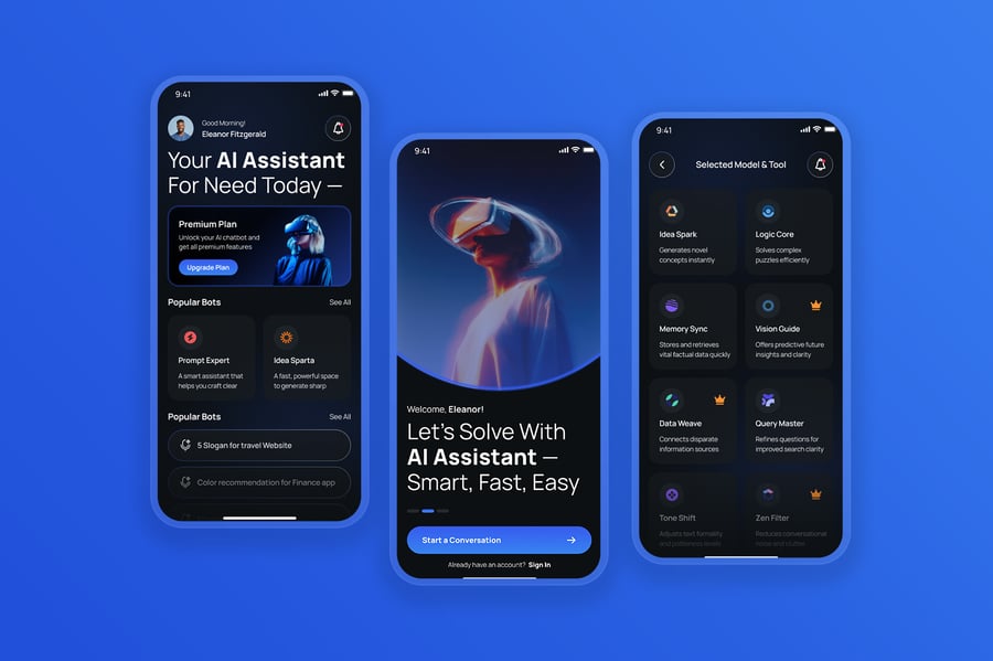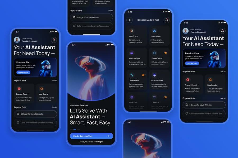 隆重推出这款智能且极具未来感的AI助手移动应用UI套件,专为专注于虚拟助手、AI聊天界面、语音指令、任务自动化、效率工具和智能推荐的应用而设计。该界面采用简洁现代的布局,搭配科技感十足的配色、流畅的组件和直观的交互模式,旨在提供无缝的AI驱动用户体验。