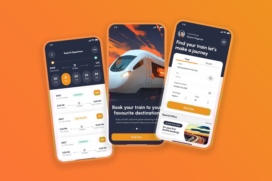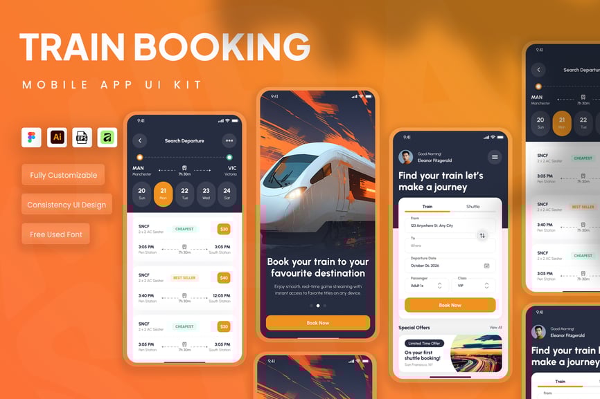 推出一款简洁易用的火车票预订移动应用UI套件,专为交通运输应用而设计,涵盖火车票预订、路线搜索、座位选择、时刻表管理、电子登机牌和支付确认等功能。该界面注重清晰度和效率,采用结构清晰的布局、易读的字体和直观的导航,确保用户获得流畅的预订体验。