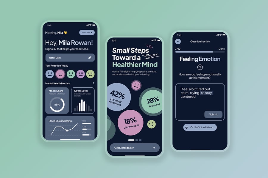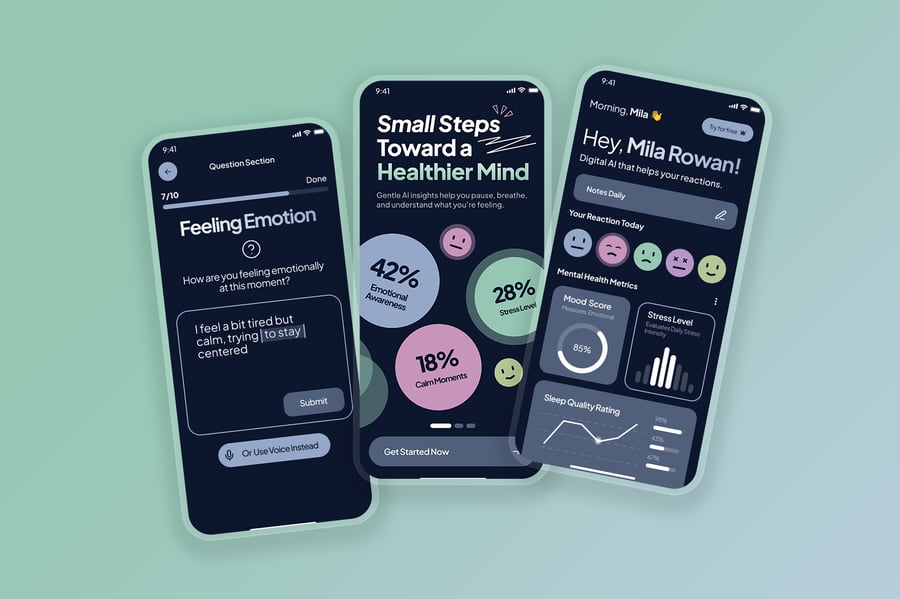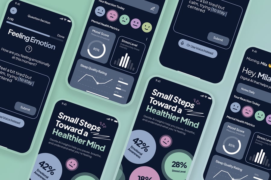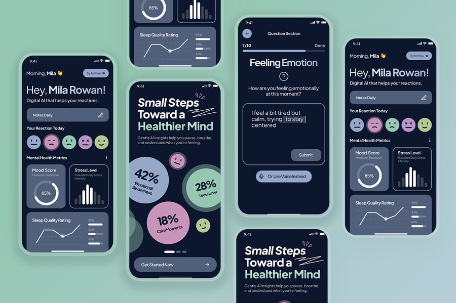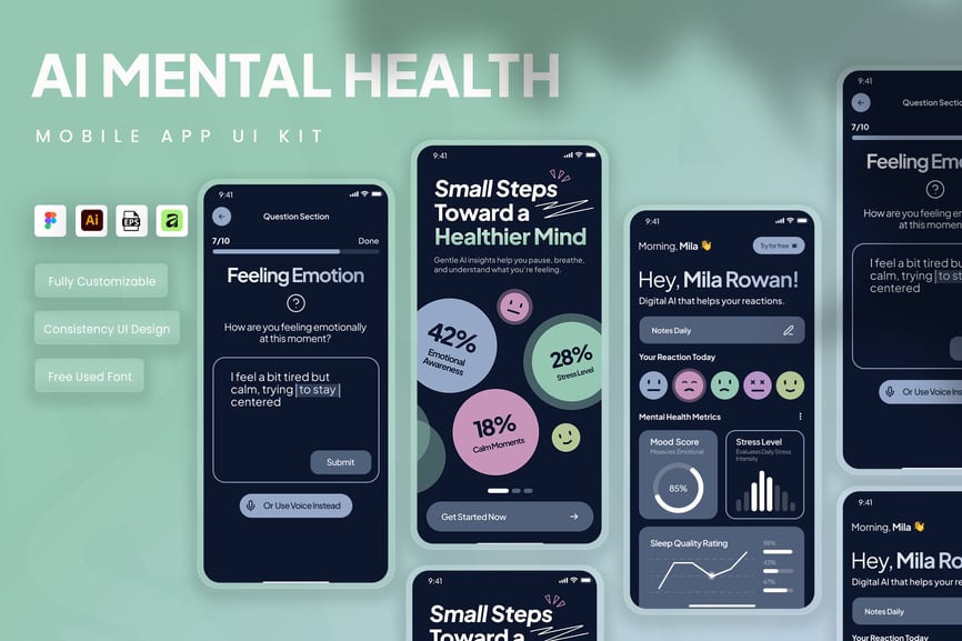 隆重推出一款平静而富有同理心的AI心理健康移动应用UI套件,专为专注于情感支持、AI心理咨询、情绪追踪、心理健康项目、引导式自我护理和压力管理的应用而设计。该界面采用柔和的配色方案、舒缓的字体和简洁的布局,旨在营造安全、支持性和用户友好的体验。