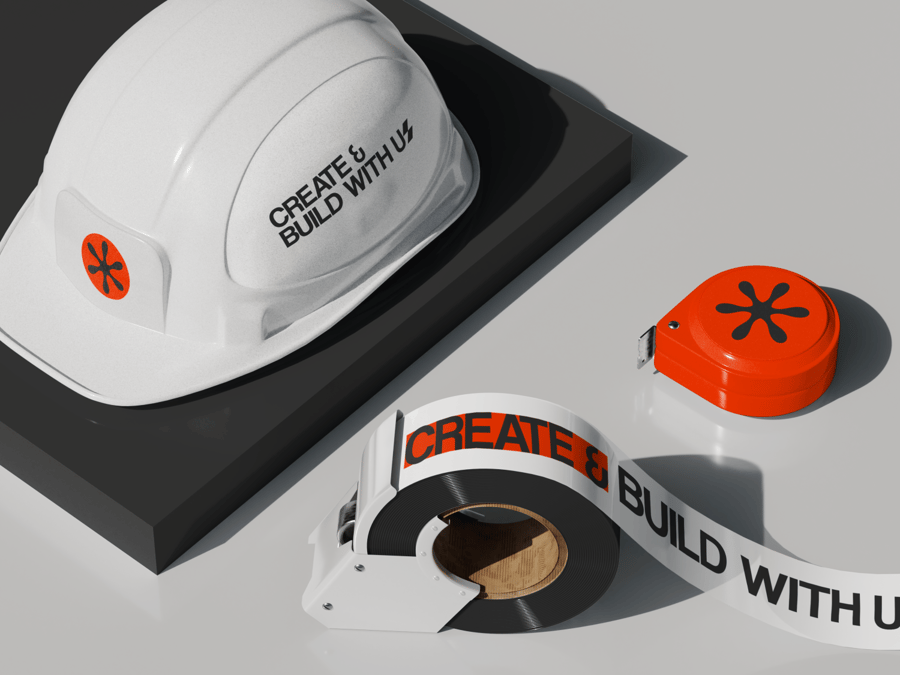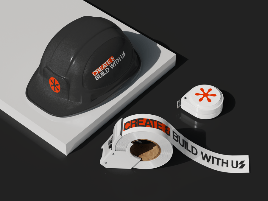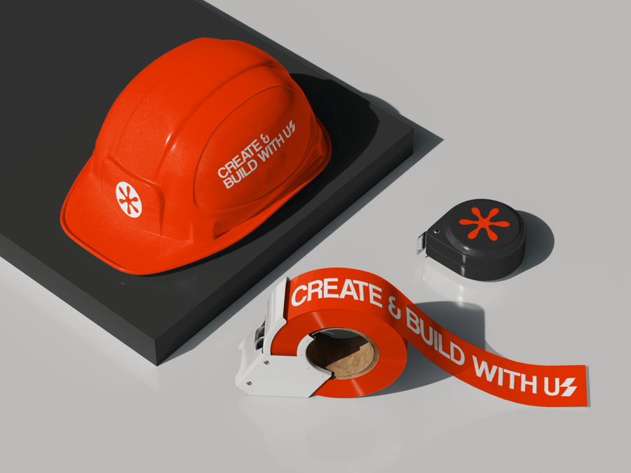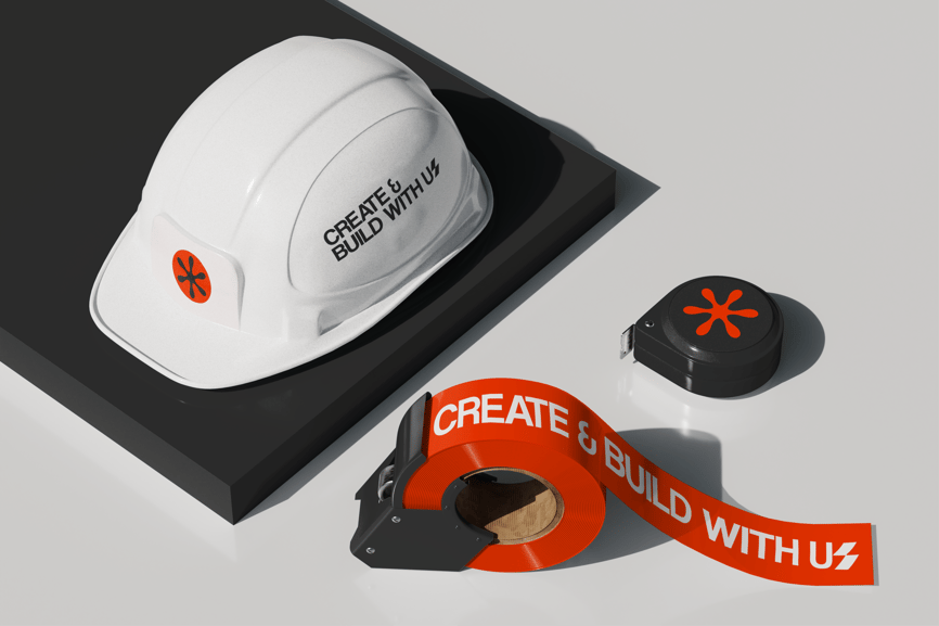 该模型包含安全帽、卷尺和胶带等重要的建筑品牌元素,非常适合向建筑公司、承包商、工程公司和工业企业展示标志、字体和视觉识别概念。