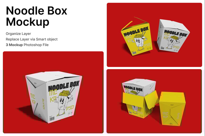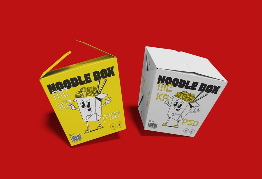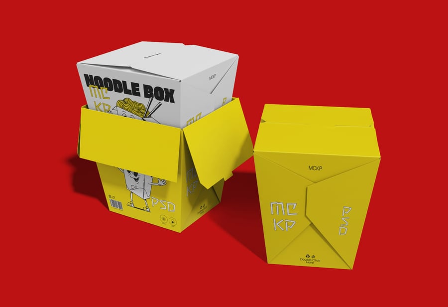 这款面条盒样机展示了一款逼真的外卖食品包装设计,采用经典的折叠纸面盒结构。盒子造型经典,具有倾斜的侧面、折叠的顶部翻盖和紧凑的方形底座,清晰地展示了正面、侧面和顶部的品牌标识区域。样机提供多种视角,展示了盒子的闭合和部分打开状态,方便用户详细查看图形、图标和文字的布局。此样机提供高分辨率 PSD 文件,并带有智能对象图层,可快速准确地进行自定义,同时保留逼真的阴影、折痕和材质深度。