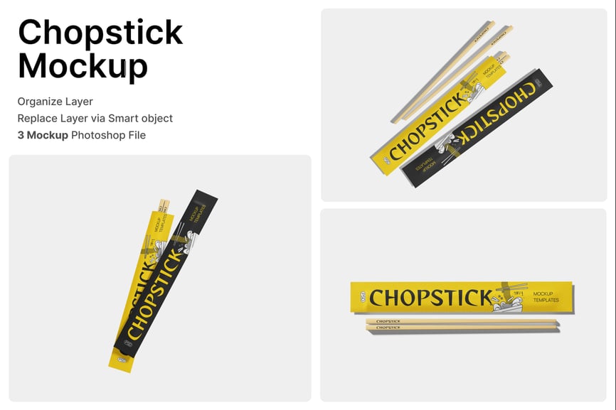 这款筷子样机以多种布局和角度,逼真地展示了一次性筷子搭配品牌纸套的效果。样机采用线条流畅的直柄木筷,搭配纤细的矩形包装套,完美呈现常见的餐厅和外卖包装样式。柔和的中性光线和阴影突显了材质纹理、清晰的字体和印刷细节,营造出真实的包装效果。样机以高分辨率 PSD 文件格式提供,并带有智能对象图层,方便用户快速精准地自定义设计、颜色和品牌元素。