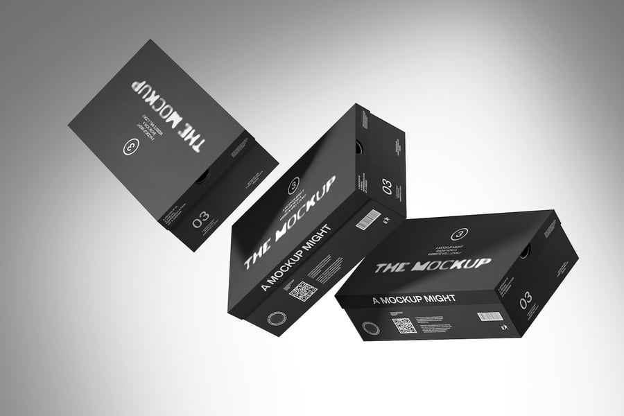 产品包装盒模型,以简洁的摄影棚构图,从多个角度展示。适用于展示零售产品的品牌、标签和包装设计理念。