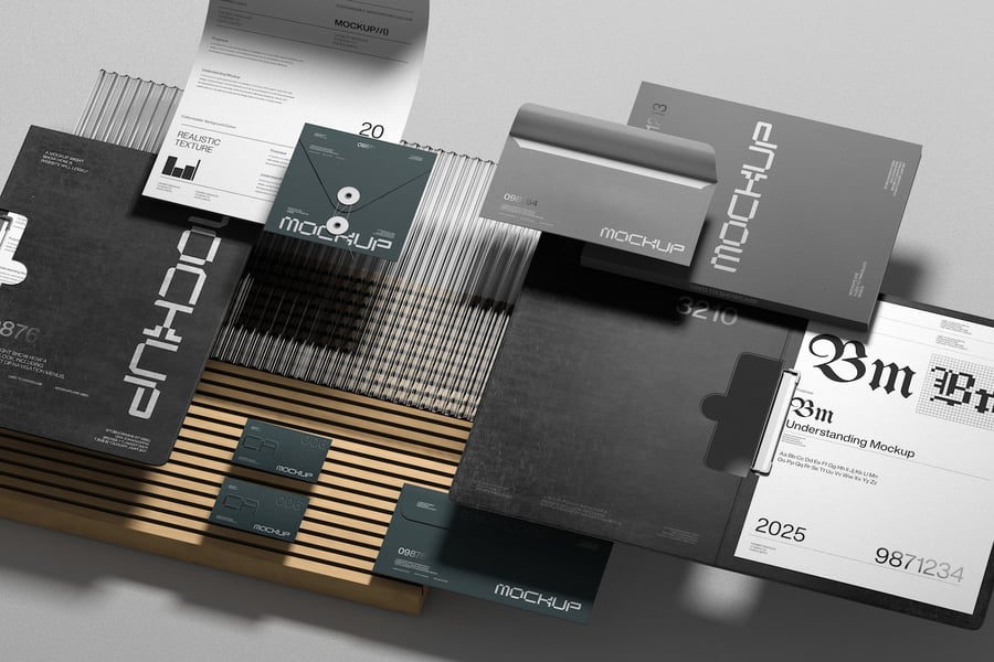 这套模型素材包含多种用于品牌推广和形象展示的办公用品。它支持在所有商业材料中保持一致的印刷布局。