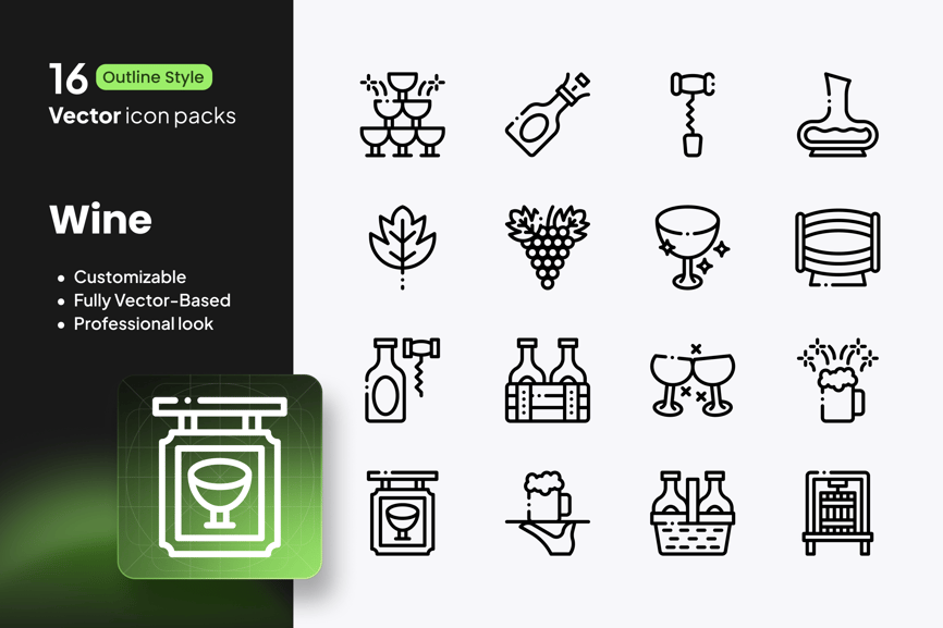 这款精美的葡萄酒图标集包含 16 个现代轮廓风格的矢量图,可为您的设计增添光彩。从酒瓶、酒杯、开瓶器、酒桶、葡萄到品鉴符号,该系列图标生动地展现了葡萄酒文化的精髓。