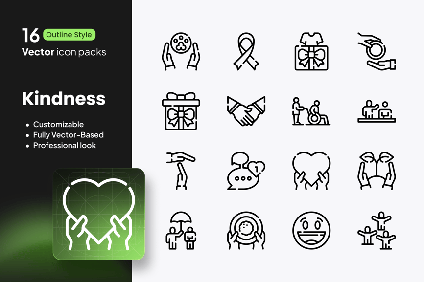 这套“友善图标”包含 16 个简洁的矢量图标,风格简洁,旨在传递积极能量。图标包括爱心、伸出援手、拥抱、礼物、微笑、丝带和社区符号,非常适合用于宣传活动、社交媒体、教育材料、生活方式项目或健康品牌推广。
