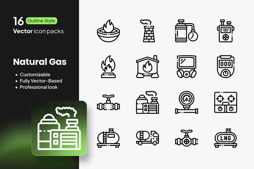 使用我们精心设计的天然气图标集,为您的能源项目增添光彩。该图标集包含 16 个精心设计的轮廓风格矢量图标。这套全面的图标集涵盖了燃气火焰、管道、储罐、计量表、工厂、安全帽和工业符号,是能源公司、环境报告、商业演示、建设项目和教育资源的理想之选。