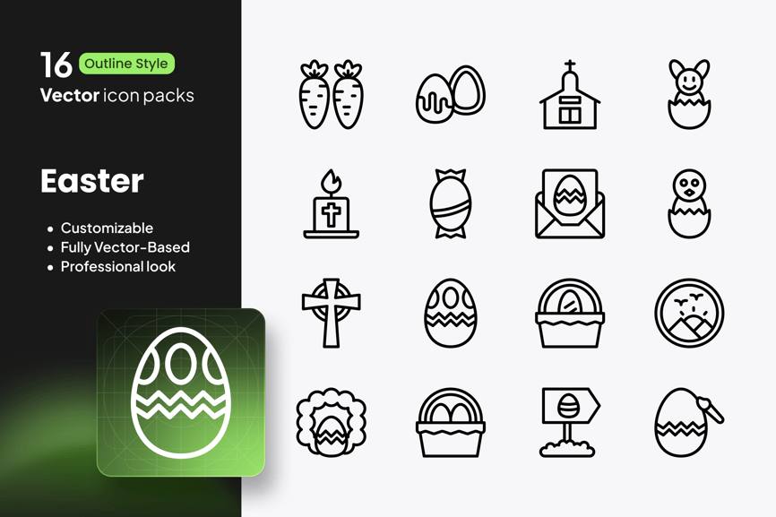 – 16 个复活节图标(彩蛋、兔子、篮子、小鸡、十字架、花朵、装饰品)