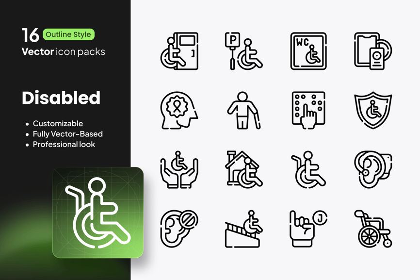 – 16 个残障和无障碍图标(轮椅、拐杖、助听器、坡道、盲文、假肢)
