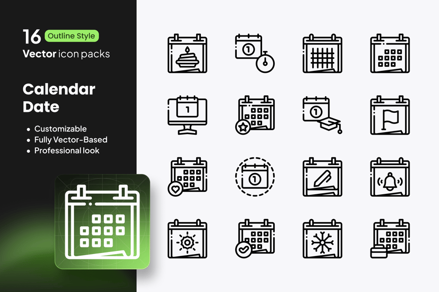 这款精心设计的日历日期图标集包含十六个设计精美的轮廓风格矢量图标,可显著提升您的组织效率。这套全面的图标集涵盖了挂历、桌面计划表、日期标记、事件提醒、时钟和日程安排符号,是生产力应用、商务演示、教育项目、生活方式博客和数字平台等各种应用的理想资源。