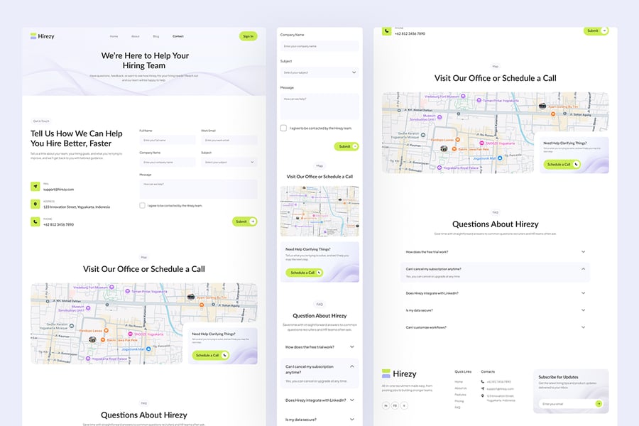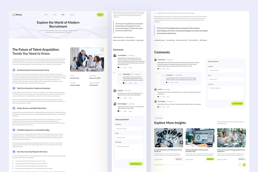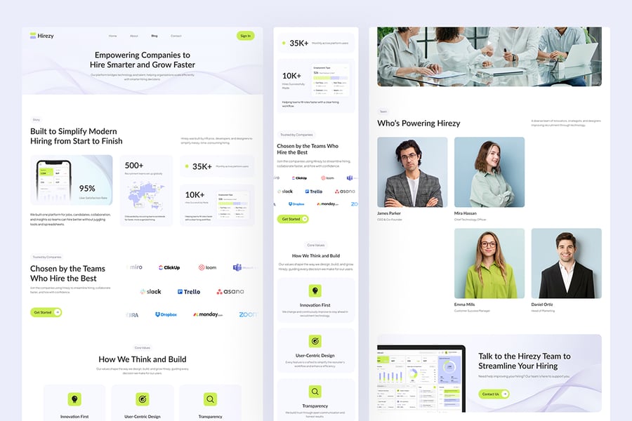 招聘网站要想成功,关键在于降低用户的不确定性。访客想知道你的产品是做什么的,它的目标用户是谁,以及他们为什么要信任它。Hirezy 的设计正是围绕这些需求展开的。首页清晰的版块、突出的亮点和恰当的行动号召 (CTA) 位置,方便用户快速浏览。关于我们页面通过展现公司价值观和团队信誉来增强用户信任。博客系统则能帮助你持续地教育和培养潜在客户。结合转化率极高的联系我们页面,该网站打造了一套完整的 SaaS 营销体验,你可以将其应用于各种招聘产品,从轻量级招聘工具到功能齐全的人力资源平台。