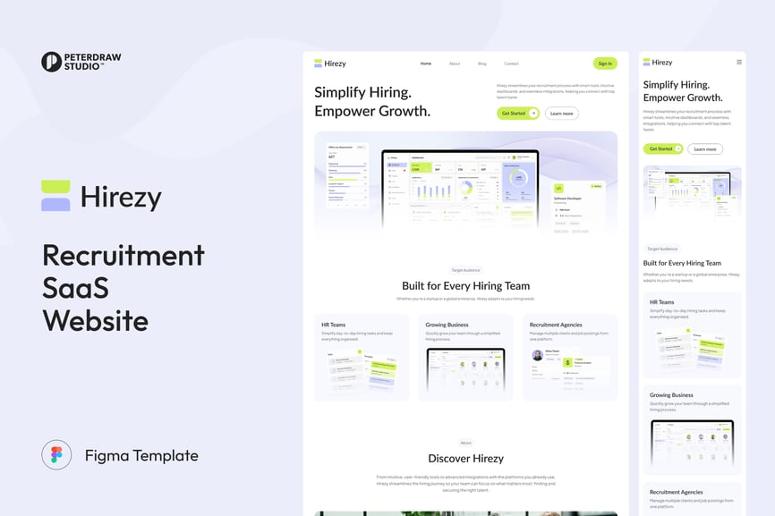 Hirezy 是一款专为人力资源团队、招聘平台和招聘初创公司设计的招聘 SaaS 网站 UI 模板,旨在打造简洁、值得信赖的在线形象,让招聘流程更清晰、更快捷、更现代化。该模板基于 Figma 构建,提供桌面和移动端视图,可帮助您介绍产品、阐述流程,并以流畅、易于转化的流程引导访客从好奇心转化为“预约通话”。