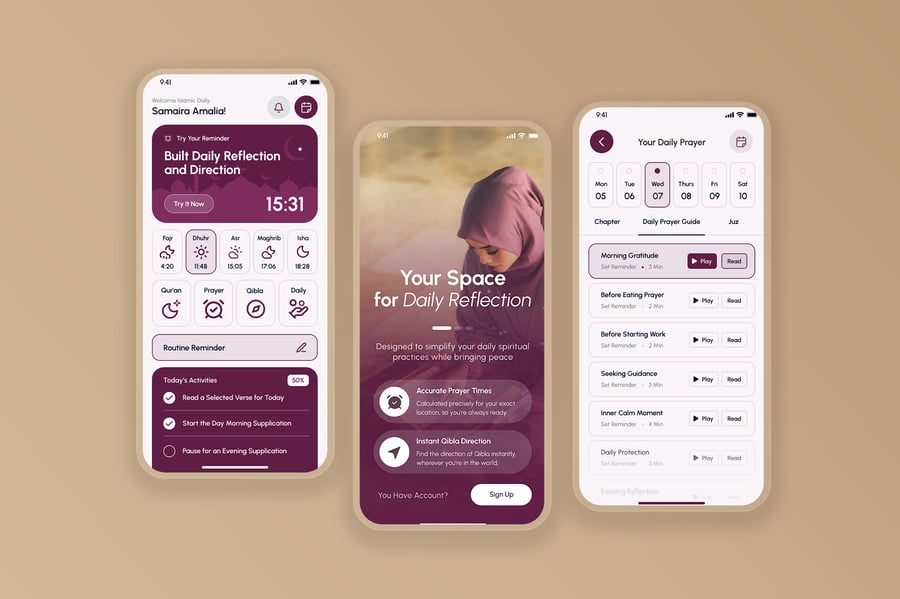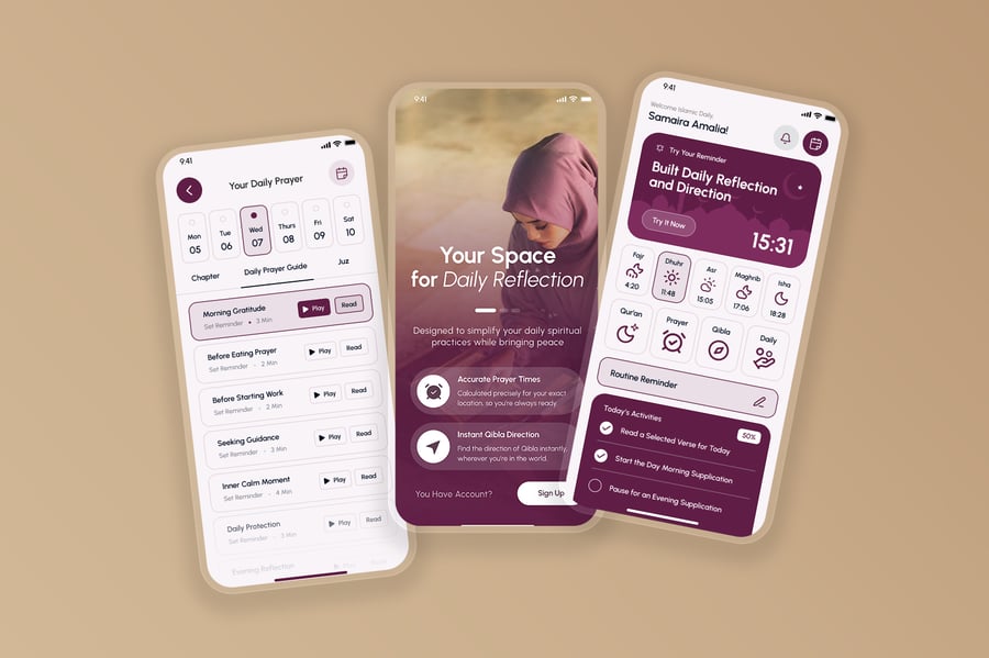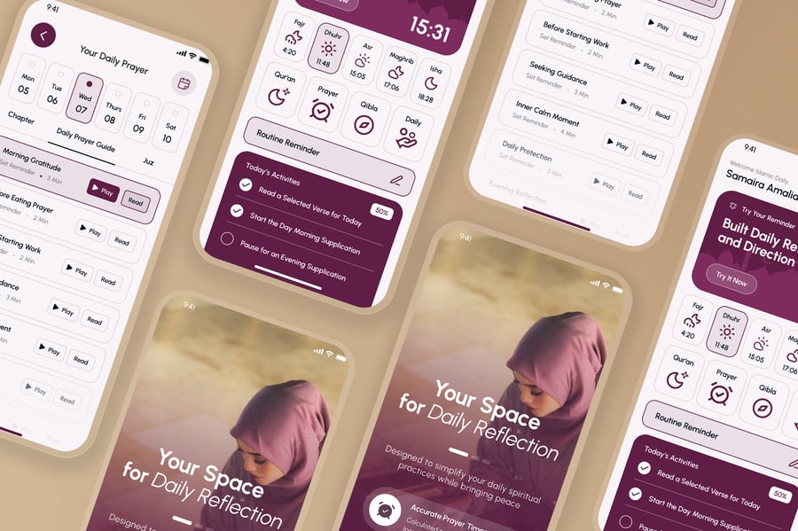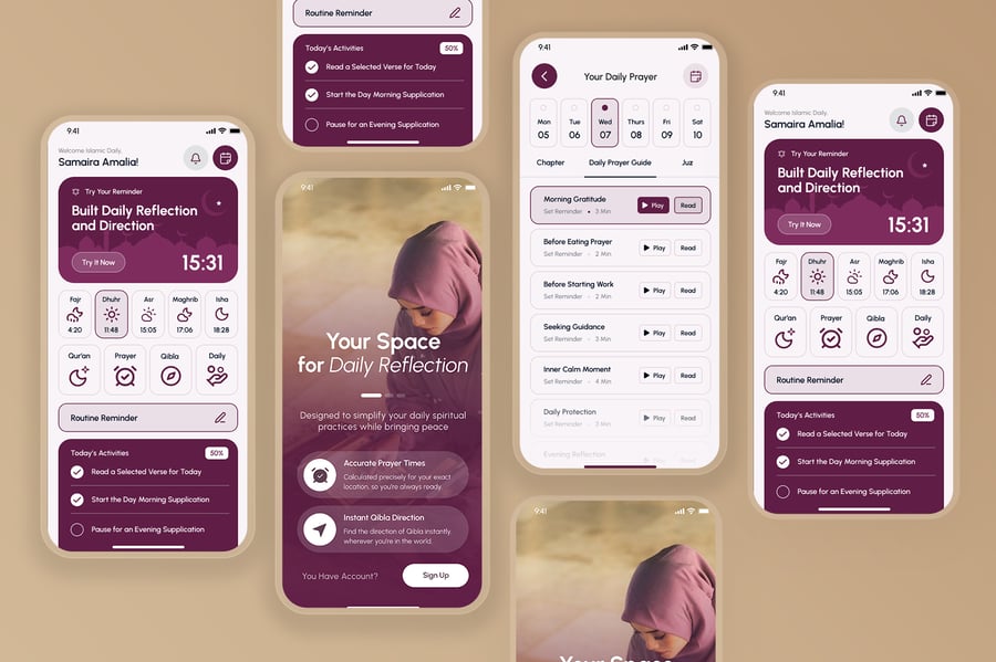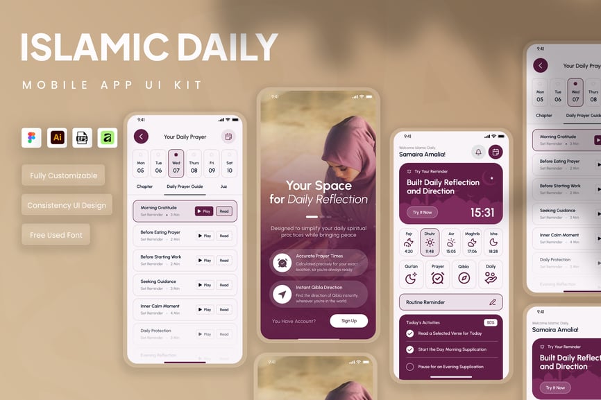 隆重推出伊斯兰日常移动应用UI套件,其界面设计简洁、平和且充满灵性,旨在支持日常伊斯兰活动。该UI套件使设计师能够以尊重和直观的方式,在移动端呈现每日祈祷时间、朝拜方向、古兰经阅读、念诵赞词和祈祷提醒、伊斯兰日历、通知以及个人进度追踪等重要功能。